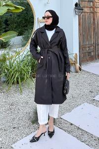 Lamelif Kuşaklı Poliviskon Trenç Siyah