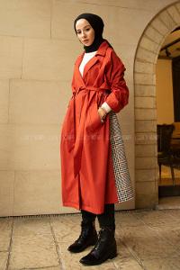 Modalamelif Arkası Ekose Desen Belden Bağlamalı Trenç Kiremit
