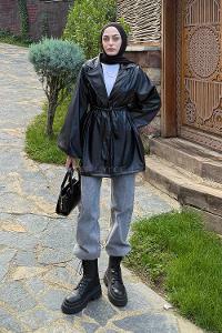 Lamelif Bağlama Detaylı Deri Mont Siyah