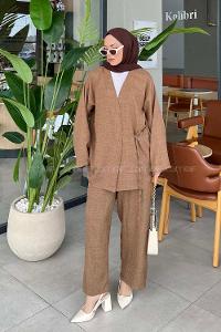 Lamelif Bağlama Detaylı Kimono Tesettür Takım Acı Kahve
