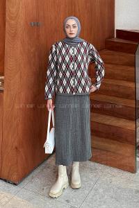 Lamelif Baklava Desen Etekli Triko Takım Antrasit-Bordo