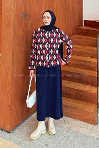 Lamelif Baklava Desen Etekli Triko Takım Lacivert-Bordo