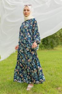 Lamelif Balon Kol Katlı Tesettür Elbise Lacivert