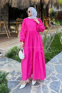 Lamelif Balon Kol Katlı Tesettür Elbise Fuşya