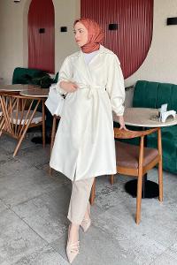 Lamelif Balon Kol Kuşaklı Trenç Krem