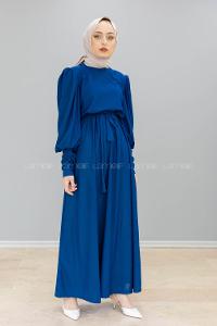 Lamelif Balon Kol Katlı Tesettür Elbise Saks Mavisi
