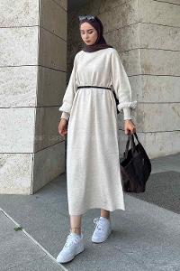 Lamelif Balon Kol Triko Tesettür Elbise Bej