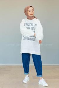 Modalamelif Balon Kol Yazı Baskılı Tunik Beyaz