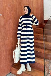 Lamelif Bebe Yaka Detaylı Çizgili Triko Tesettür Elbise Lacivert
