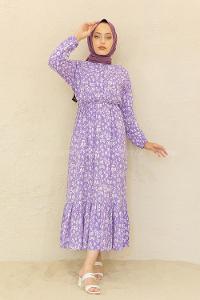 Modalamelif Bel Büzgülü Papatya Desen Elbise Lila