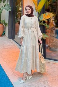 Lamelif Balon Kol Bağlamalı Tesettür Elbise Kum Beji