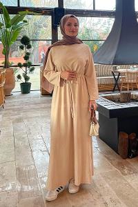 Lamelif Bel Tünel Detaylı Elbise Bej