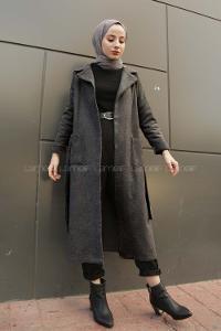 Modalamelif Belden Bağlamalı Çift Cep Detaylı Kaşe Kaban Antrasit