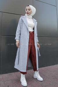 Modalamelif Belden Bağlamalı Çift Cep Detaylı Kaşe Kaban Gri
