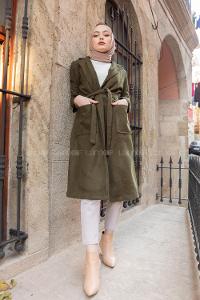 Modalamelif Belden Bağlamalı Kaşe Kaban Haki