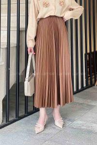 Lamelif Beli Elastik Detaylı Pliseli Etek Camel