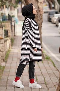 kapüşon yaka, uzun kollu, çizgili etek ucu küçük yırtmaçlı, detaylı tunik.