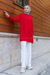 Lamelif Bisiklet Yaka Arma Detaylı Tunik Kırmızı