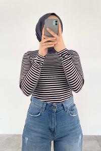 Lamelif Bisiklet Yaka Çizgili Body Siyah Beyaz