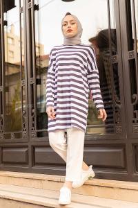 bisiklet yaka, rahat kesim, düşük kol, kalın çizgili tunik.