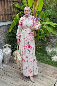 Lamelif Bohem Çiçek Desenli Tesettür Elbise Eflatun