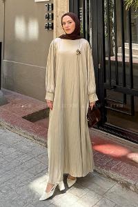 Lamelif Broş Detaylı Tesettür Elbise Vizonrengi