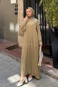 Lamelif Taş Detaylı Tesettür Elbise Soft Kahve