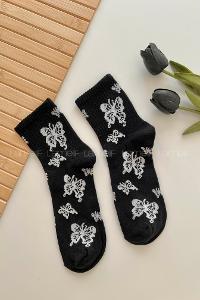 Lamelif 5 Çift Siyah Beyaz İnek Desenli Çizgili Tenis Çorabı