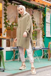 Modalamelif Büyük Düğmeli Yanları Yırtmaçlı Gömlek Haki