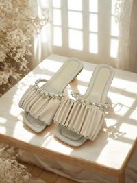 Lamelif Büzgülü İnci Detaylı Sandalet Krem