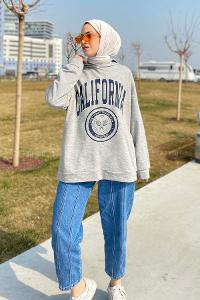Lamelif California Baskı Detaylı Kapüşonlu Sweatshirt Gri
