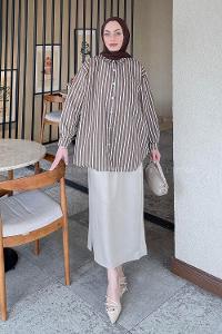 Lamelif Carla Çizgili Tesettür Gömlek Soft Kahve