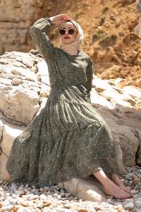 Lamelif Balon Kol Katlı Tesettür Elbise Yağ Yeşili