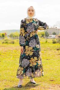 Lamelif Balon Kol Katlı Tesettür Elbise Yağ Yeşili
