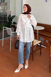 Lamelif Çiçek Desenli Tesettür Tunik Beyaz