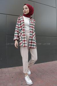 Modalamelif Çift Cepli Eteği Saçaklı Ekose Gömlek Bordo