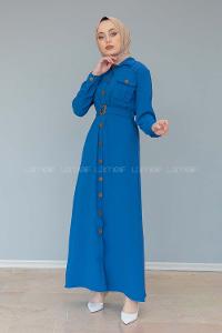 Lamelif Balon Kol Katlı Tesettür Elbise Saks Mavisi