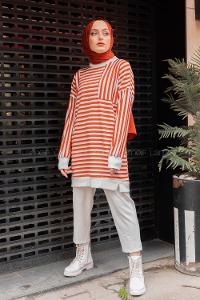 Modalamelif Çizgili Süs Cep Detaylı Sweat Kiremit