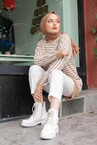 Modalamelif Çizgili Süs Cep Detaylı Sweat Sütlü Kahve