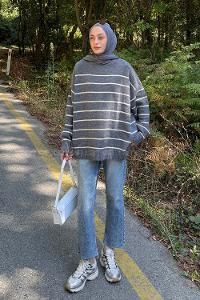 Lamelif Çizgili Triko Kazak Gri