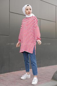 bisiklet yaka, kalın çizgili, etek ucu yandan yırtmaçlı, rahat kesim, spor tunik.
