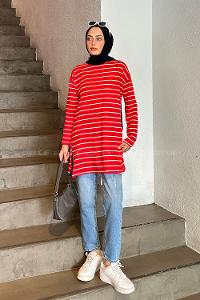 Lamelif Çizgili Uzun Kol Tunik Nar Çiçeği