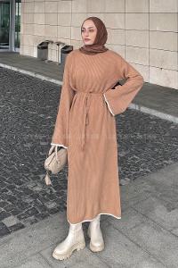 Lamelif Çoban Dikişli Triko Elbise Camel