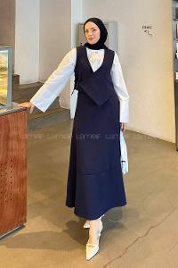 Lamelif Denim Yelek-Etek İkili Tesettür Takım Koyu Mavi