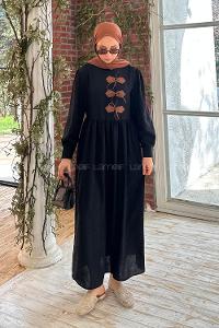 Lamelif Deri Detaylı Tesettür Elbise Siyah
