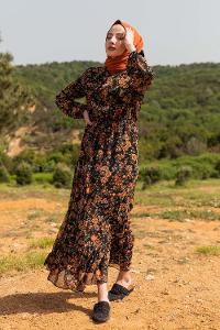 Lamelif Balon Kol Katlı Tesettür Elbise Siyah