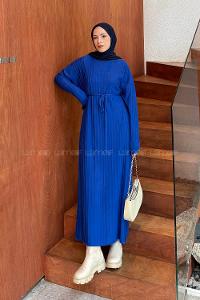 Lamelif Dikiş Detaylı Tesettür Elbise Saks Mavisi