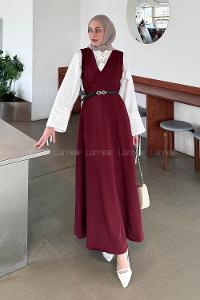 Lamelif Düğme Detaylı Kolsuz Tesettür Elbise Bordo