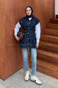 Lamelif Düğmeli Kot Yelek Koyu Mavi