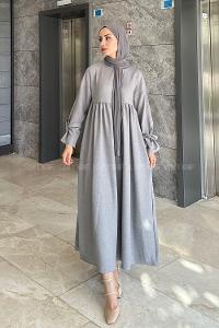 Lamelif Düşük Kol Bağlamalı Keten Tesettür Elbise Gri